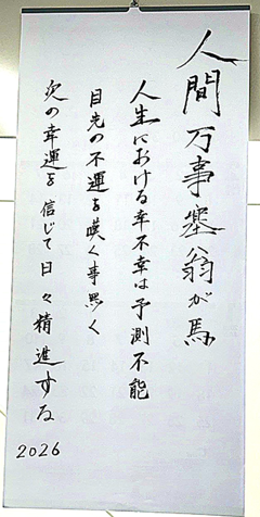 進む姿勢を強調 を書初めし、1年間本社に掲載しました。今年は、午年に因んで「人間万事塞翁が馬」人生における幸不幸は